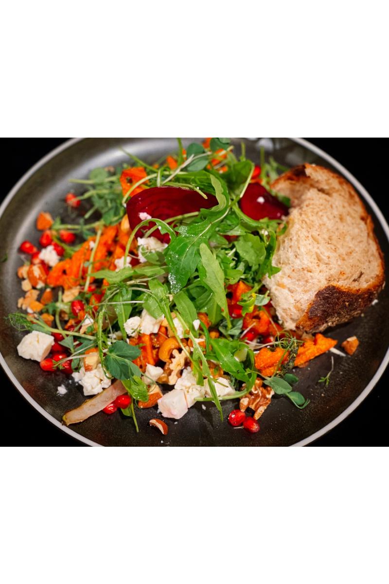 Ovnsbakt chevre, Saltbake beter fra Ner-Salberg gård, søtpotet, ruccolasalat, granateple, toppet med honningristede valnøtter.
